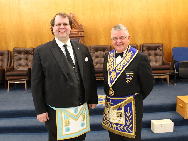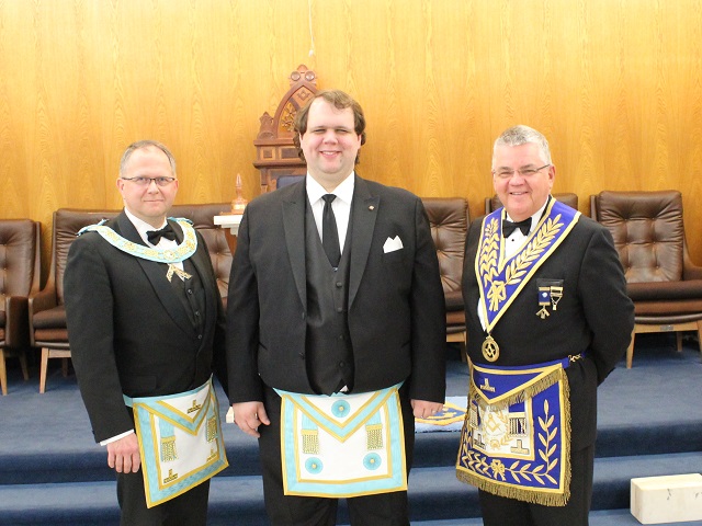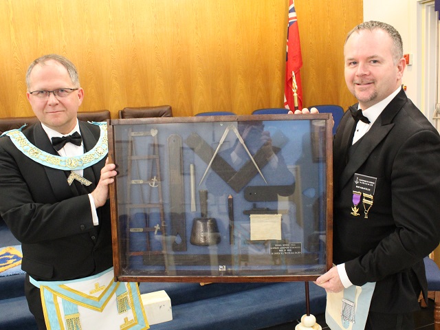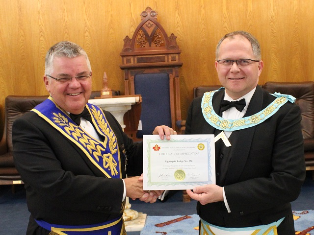 At Algonquin Lodge No. 536’s 1000th regular meeting, Bro. Simo Rautiainen was raised. The working tools that were used at their first meeting were on display. As well, R.W. Brian Koivu, Treasurer of the Masonic Foundation of Ontario, presented a Certificate of Appreciation from the Masonic Foundation of Ontario for Algonquin Lodge’s generous donation to the Prostate Hope Prostate Cancer Research Project.
