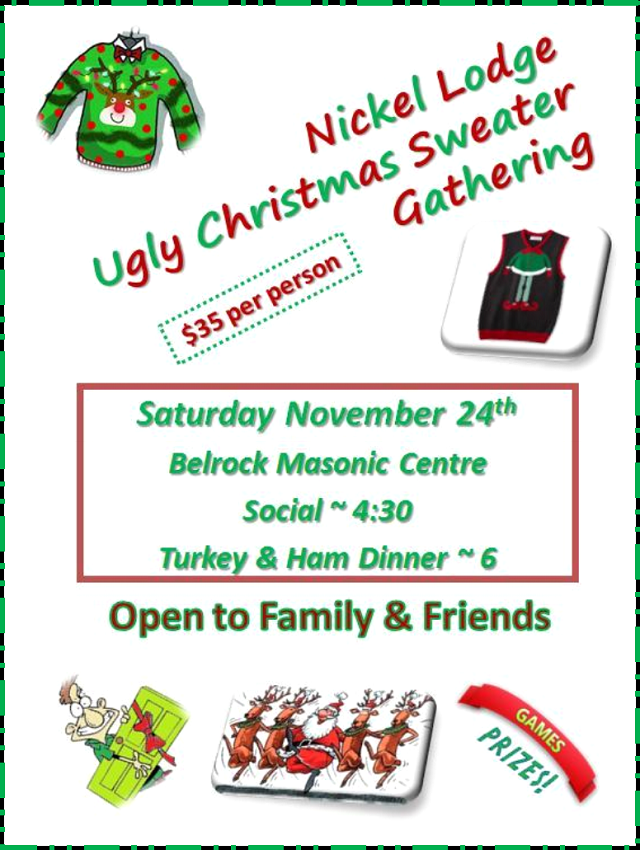 Nickel Lodge No. 427 will be having an Ugly Christmas Sweater Gathering at Belrock on November 24th, 2018.