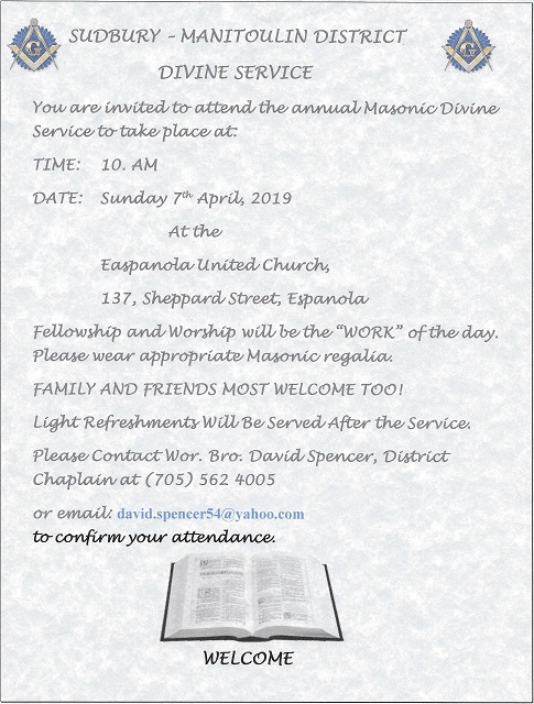 District Divine Service April 7 in Espanola. Masonic regalia to be worn.