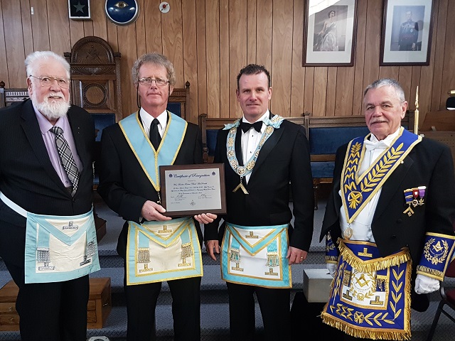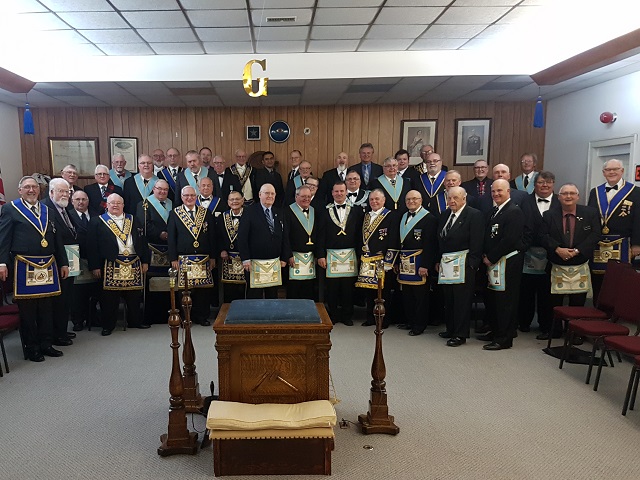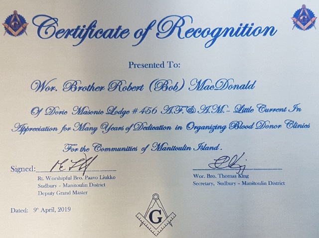 At Doric Lodge No. 455’s Official Visit by R.W. Bro. Paavo Liukko in May 2019, attendance was great to witness a couple years a mason pin presentations and an award for Blood Donation work.