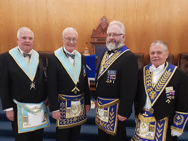 While it is unusual for pictures to be taken for Nickel Lodge No. 427’s Annual Memorial Service, an exception was made this year. (Right to Left) On June 5th, 2019, our D.D.G.M., R.W. Bro. Paavo Liukko attended on a fraternal visit to his home lodge. Also, with our W.M. out of town that day, R.W. Bro. Rob Fleming helped by assuming the chair and R.W. Bro. J. David Innes reprised his IPM role he had last year. Finally, assuming his new role as D of C was W. Bro. Brian Howe.