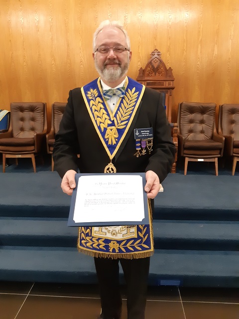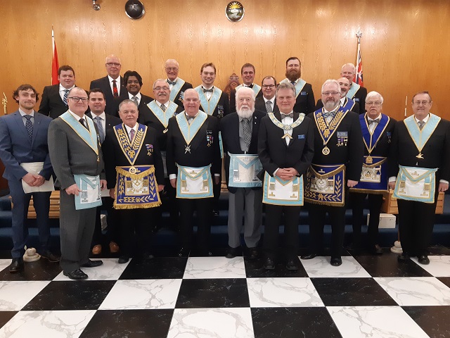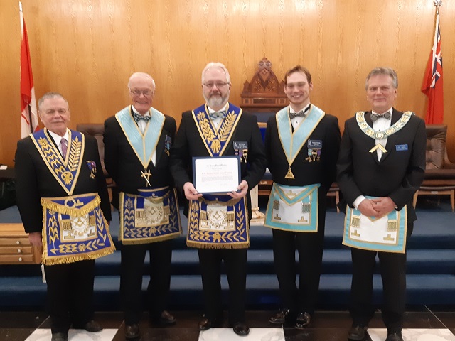 R.W. Bro. Robert J. Fleming was celebrated for his being 25 years as a Past Master at Nickel Lodge’s December 2019 meeting. The ceremony was special with his son, W. Bro. Stephen Fleming in the East and with R.W. Bro. Paavo Liukko’s and R.W. Bro. David Innes’ assistance.