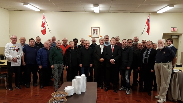 Brethren in attendance at the District Meeting held at Belrock Masonic Centre Nov. 4, 2019. Dressed in business attire in the center of the photo are DDGM R.W. Bro. Robert Lipic and District Secretary W. Bro. Ryan Lipic.